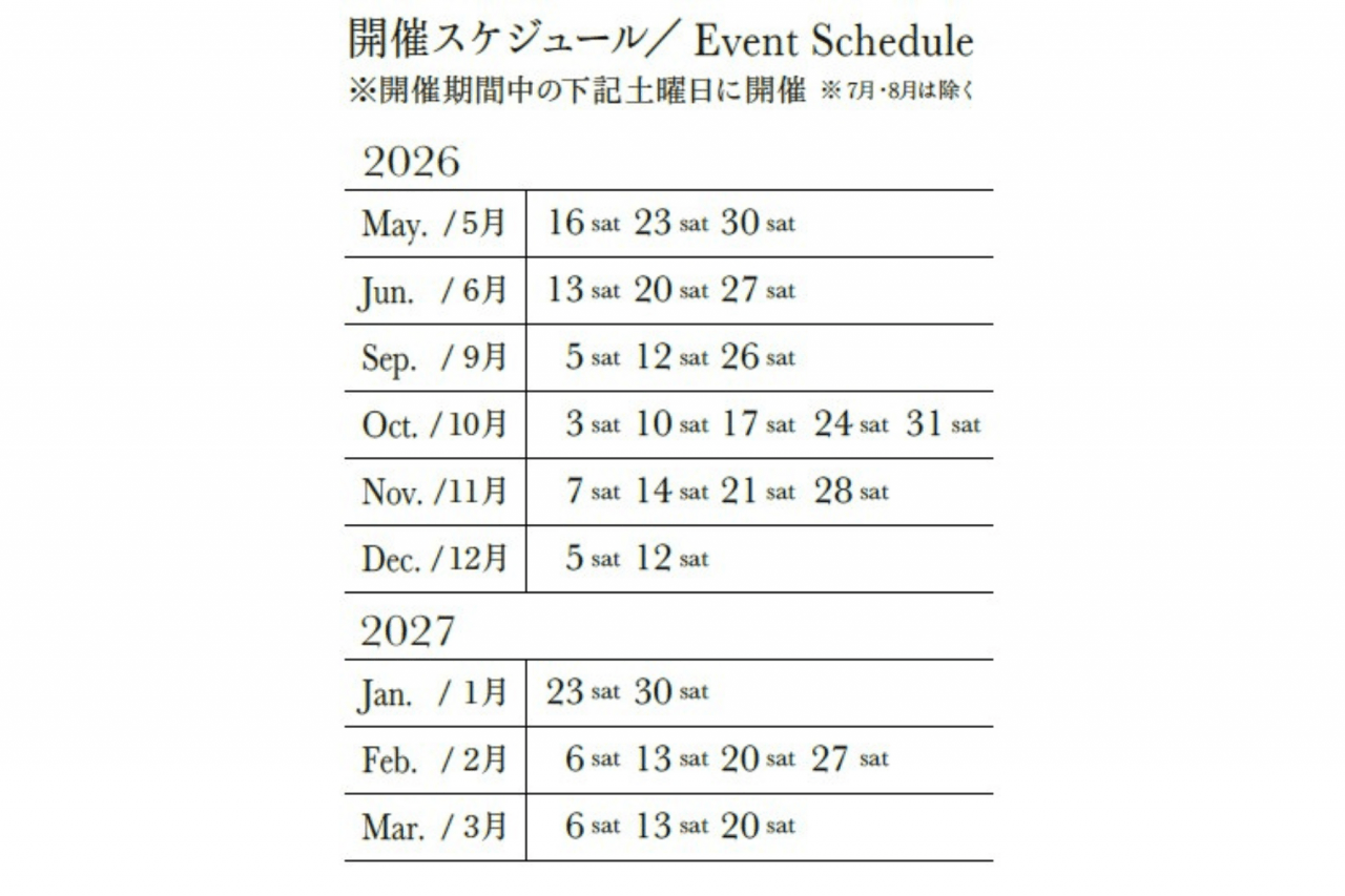 Scheduled dates: Saturdays from May 16, 2026 to March 20, 2027 (Excluding July, August, and the New Year holidays)