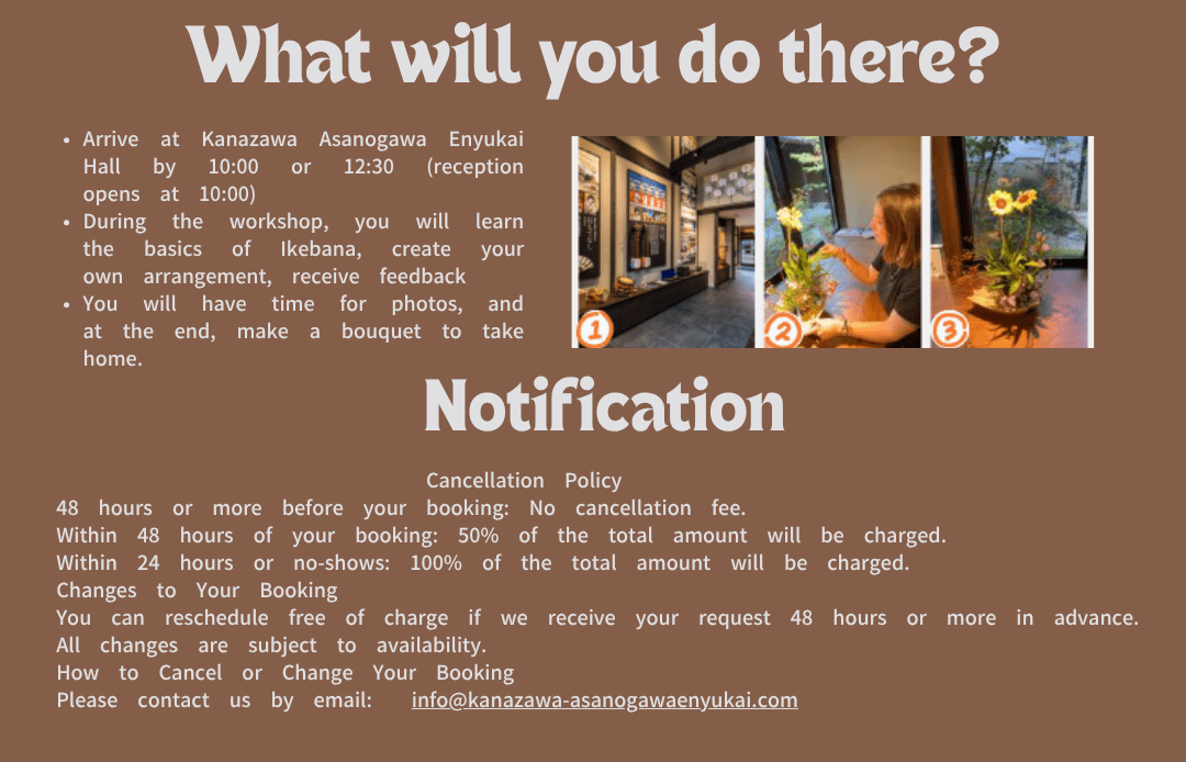 If you would like to book an Ikebana workshop, please contact us in advance (at least 2–3 days before) by email: info@kanazawa-asanogawaenyukai.com