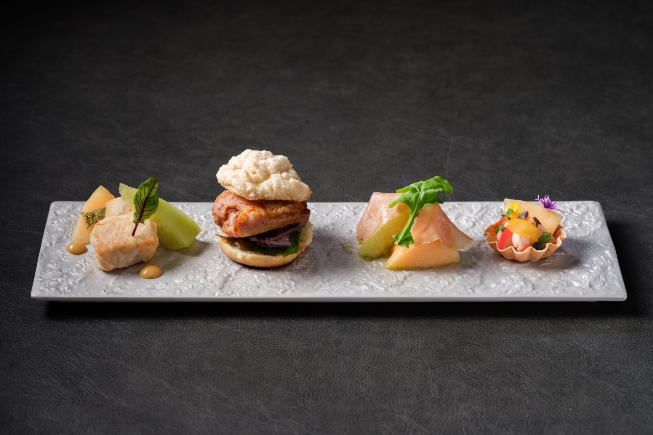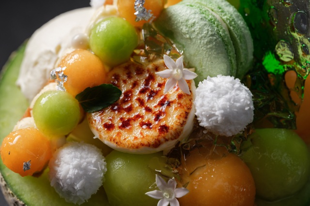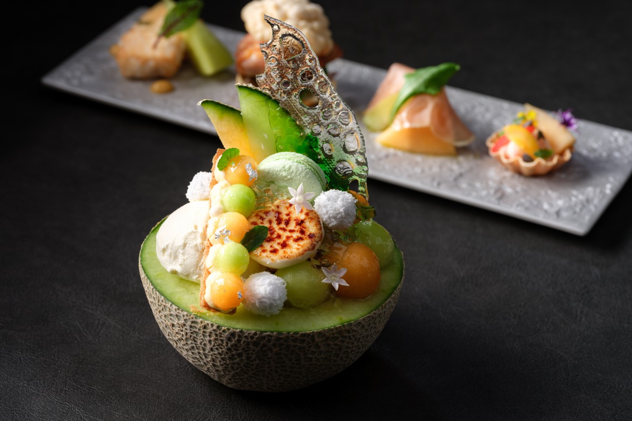 Delight in a blissful bowl served in a halved melon, filled with an assortment of delicate sweets and complemented by savory creations featuring unique pairings. This early-summer offering brings together the vibrant sweetness of fresh fruit, diverse ingredients and a touch of culinary playfulness — creating a refined and memorable experience not to be missed.