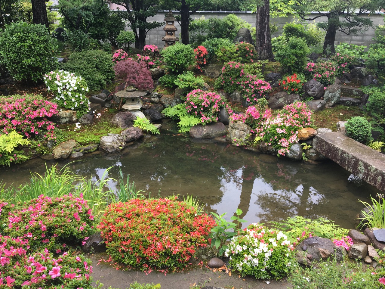 The garden features carefully maintained Japanese black and red pines, as well as colorful azaleas and rhododendrons that bloom spectacularly from spring to early summer.