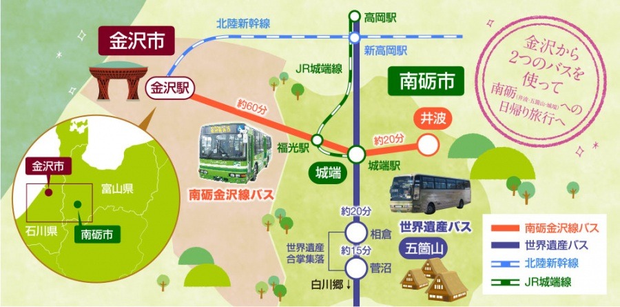 For travel from Kanazawa, the Nanto-Kanazawa Line (operated by Kaetsunoh Bus) is convenient. It takes about 60 minutes to get to Fukumitsu and Johana in Nanto City, and about 75 minutes to Iba without changing trains. The World Heritage Site Gokayama can be visited in about 20 minutes by transferring from Johana to the World Heritage Bus (operated by the Kaetsunoh Bus).
