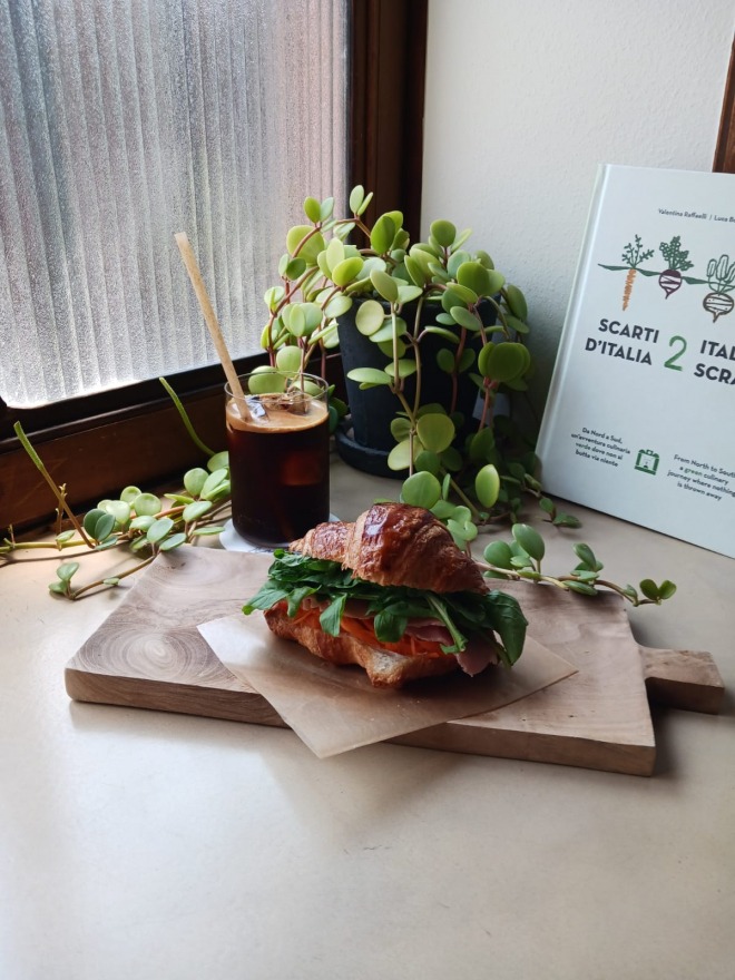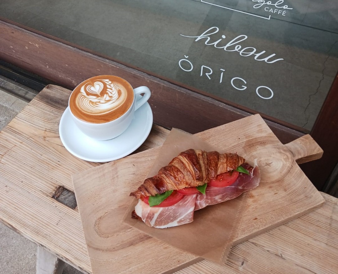 The cafe serves croissant sandwiches filled with ham, cheese, and vegetables in two sizes (S and L). On weekends, they also offer a toast set (drinks not included). Popular breakfast items include "Bombolone," a donut filled with cream, and "Banana Bread." The cafe opens at 8:00 AM, and recommended breakfast items include the "Croissant Sandwich" and "Bombolone." On weekends, the toast set is also available.