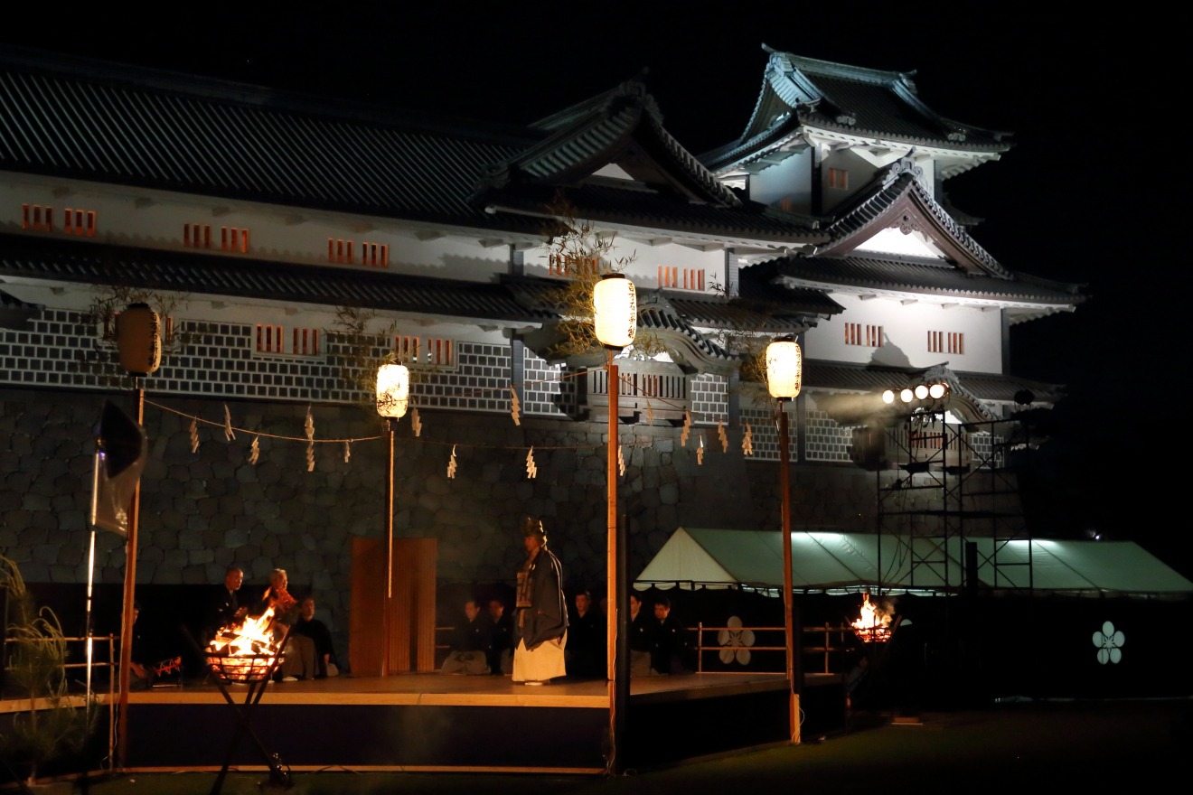 Kanazawa Castle and Kenrokuen Garden will be opened free of charge at night and lit up. A related event of the Kanazawa Hyakumangoku Festival, “Hyakumangoku Takigi Noh (Noh Play)” will also be held.