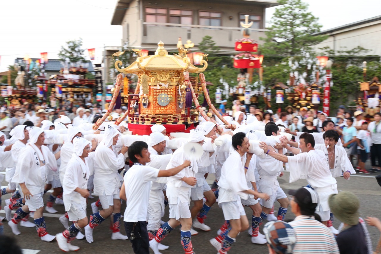 This summer festival is a Shinto ritual designated as an Intangible Folk Cultural Asset by Kanazawa City. The portable shrine procession features floats and drum stands, and folk performing arts such as demon exorcism, lion dances, children's dance and Kagatobi ladder-climbing are performed.