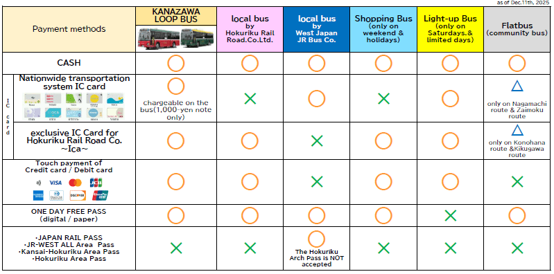 Tips: Please note that some buses do not accept nationwide IC transportation cards. Refer to the table below to prepare the appropriate payment method.
