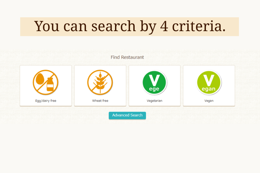 You can search by four criteria: “Egg-free/dairy-free,” “Wheat-free,” “Vegetarian,” and “Vegan” (multiple criteria can be selected).