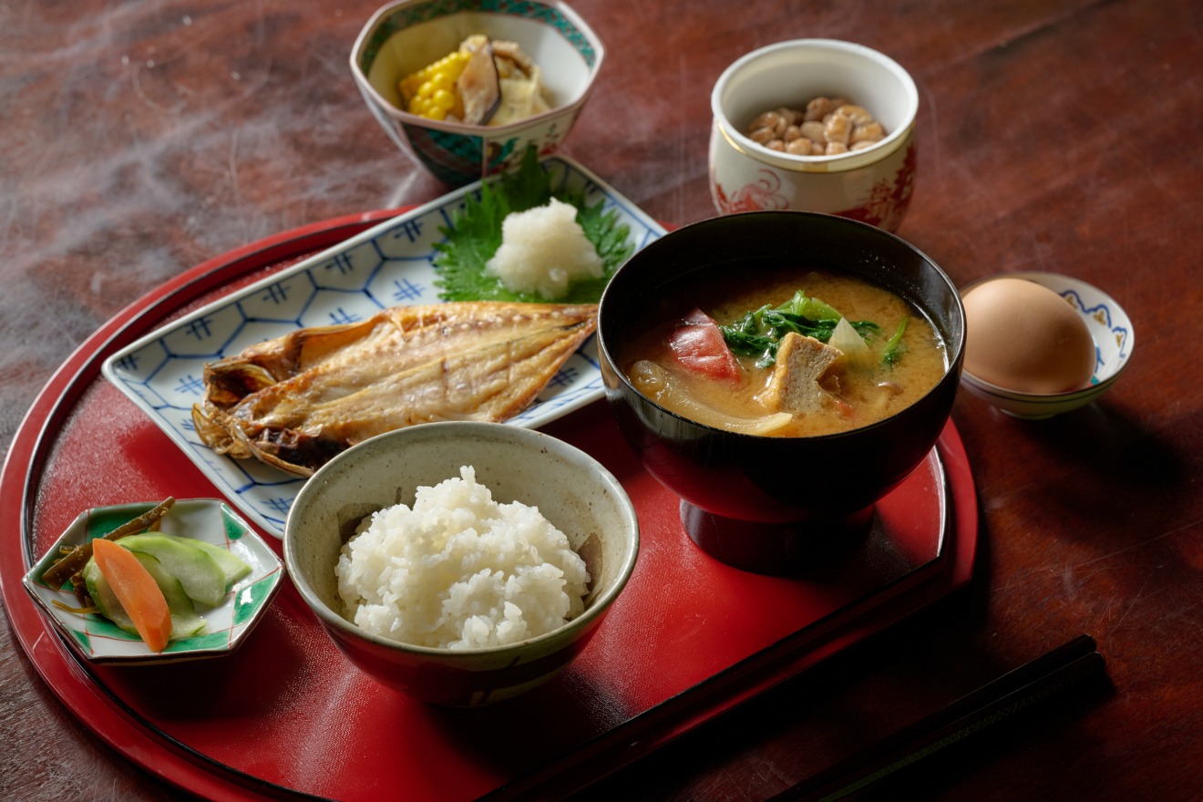Freshly-polished rice cooked in a copper pot and miso soup with plenty of ingredients, served with homemade pickles. For the main dish, you can choose from home-made dried local fish or grilled chicken with miso marinated in Shinshu miso.