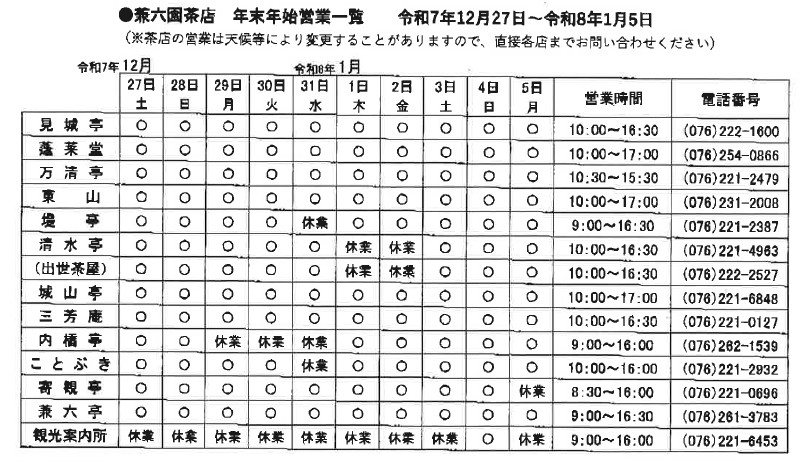■New Year Holiday Operating Schedule of Restaurants in & around Kenrokuen Garden