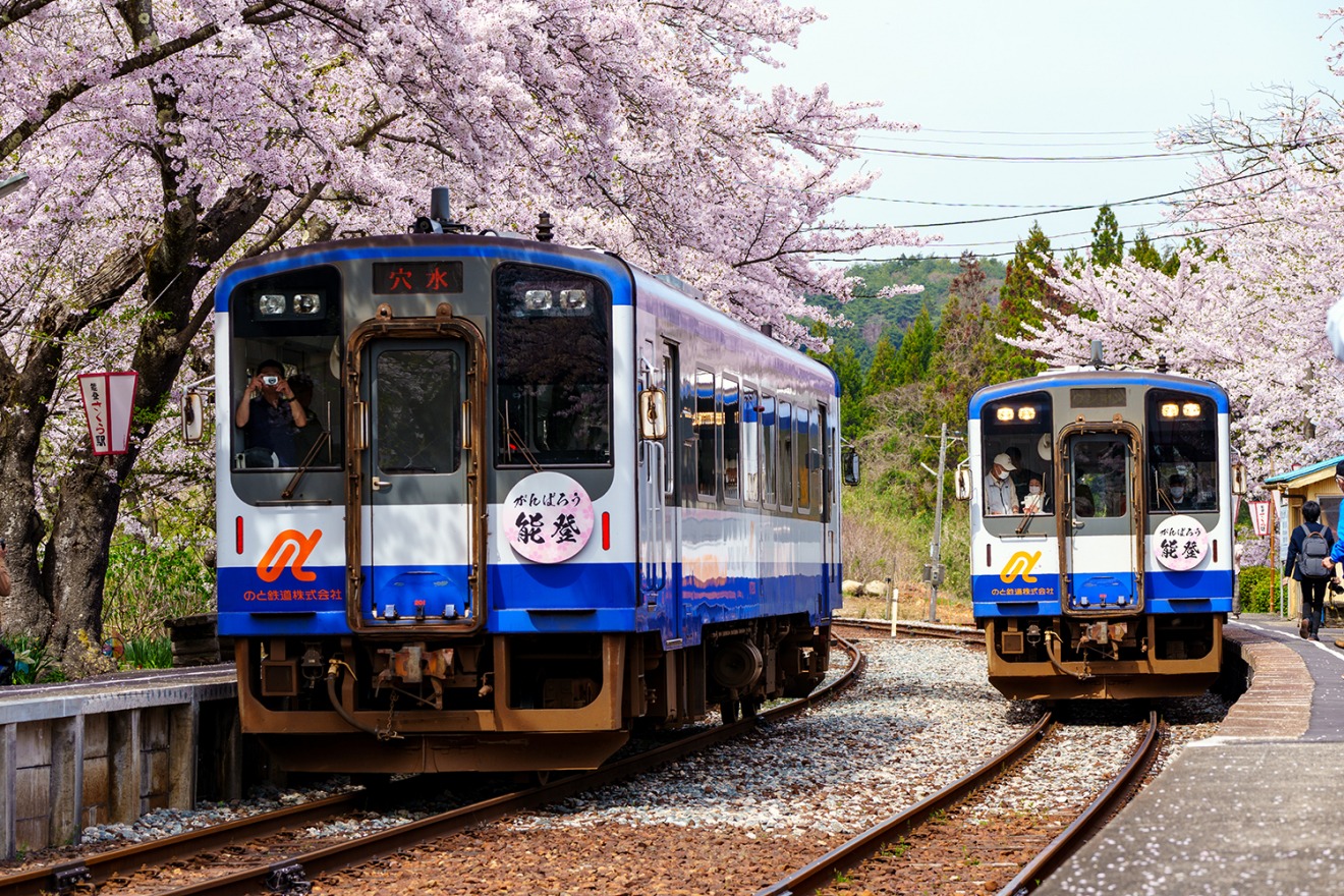 Noto-Kashima Station (Anamizu Town): Nicknamed "Noto Sakura Station", its platform is lined with around 100 cherry blossom trees. From the platform, you can also enjoy a sweeping view of Nanao Bay. In mid-April, when the cherry blossoms are in full bloom, many people visit and food stalls line the station front.