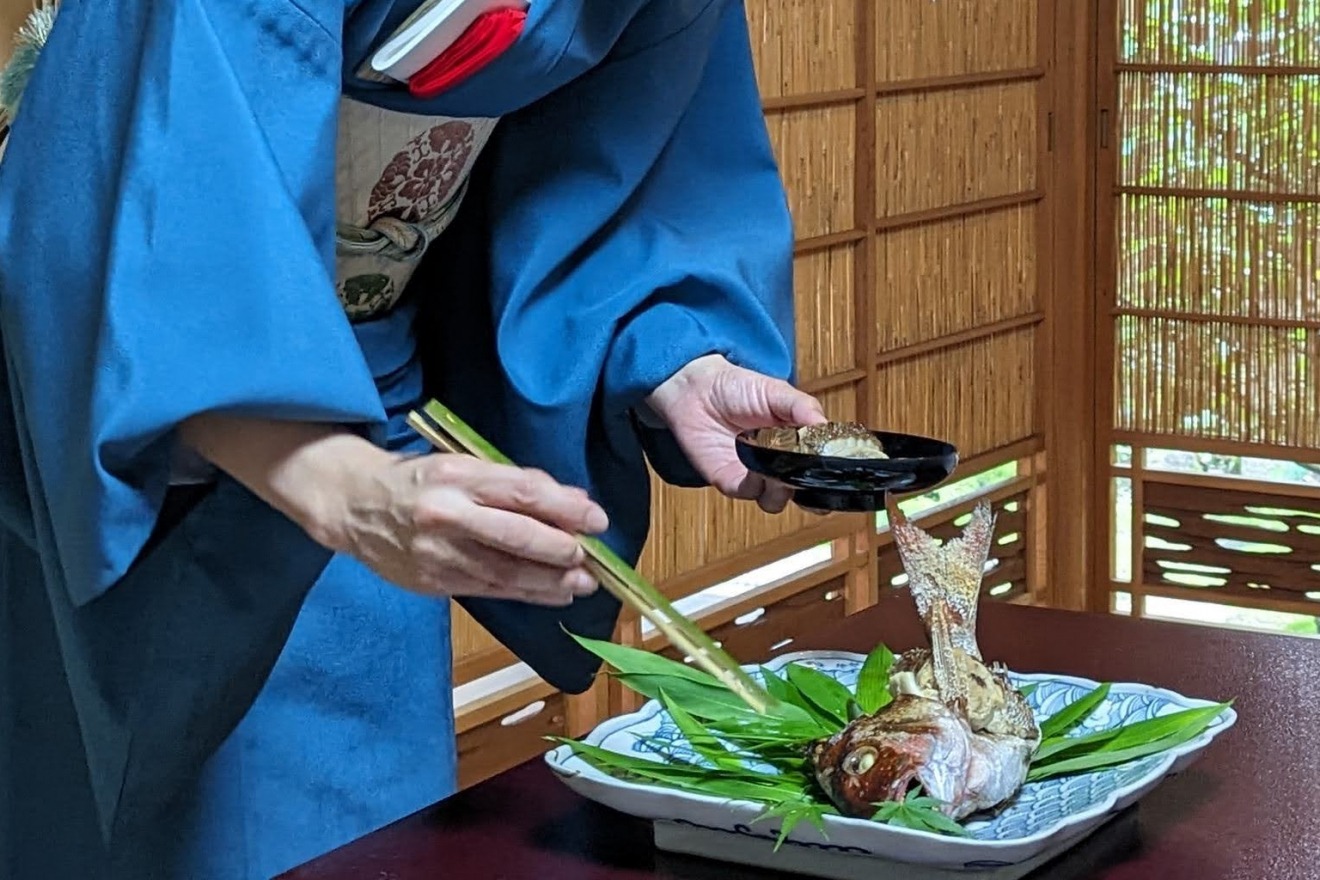 One of the highlights is the dramatic tai no honezake—a sea bream head served in a large Kutani ware dish. Hot sake is poured over the fish, ignited to burn off the alcohol, and served as a savory broth. This eye-catching presentation evokes the samurai cuisine of the Kaga domain. While staying true to the spirit of tea ceremony, the course is designed to be approachable, allowing guests to enjoy authentic Japanese culinary culture in a relaxed, welcoming setting.