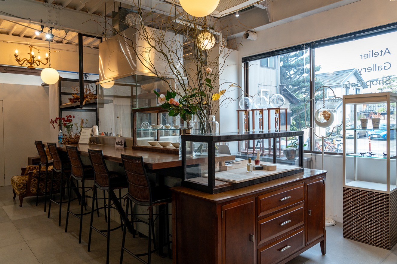 The shop is housed in a traditional Japanese building that reflects the charm of the Nagamachi Samurai District. Inside, you'll find a variety of spaces where you can enjoy Kutani ware from different perspectives—a sales area, a gallery room, and dining counters with views of a tea room and garden.