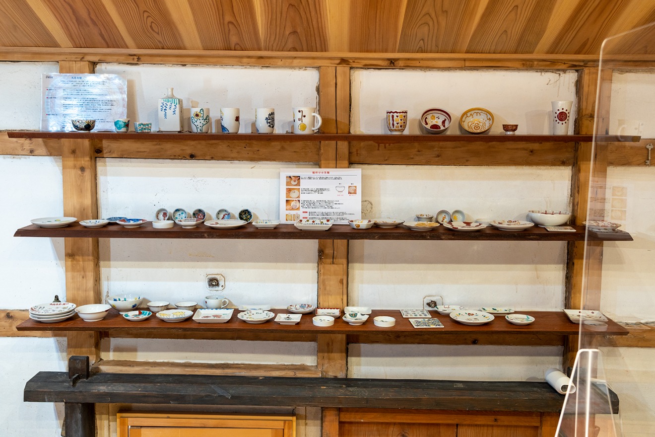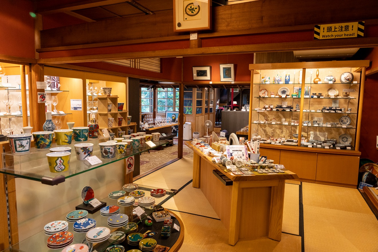 Visitors can experience "Rokuro" (potter's wheel), "Kutani gosai" (five-colored porcelain), and "Akae kinsai" (red glaze with gold leef) at the pottery studio, which was renovated from a warehouse built in the Meiji period. It also has a gallery, store, and café.