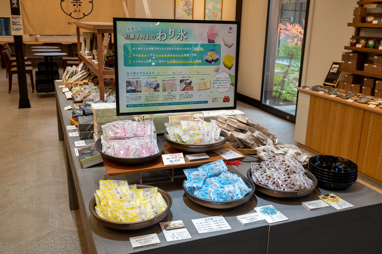 The Japanese sweets cafe produced by "Wagashi Murakami", as known as Fukusa Mochi (wrapped rice cake), Wari gori (confectionery sugar and agar). At this cafe, where the old row-house gate still remains, you can eat Buke Yashiki Plate and Kinpaku (gold leaf) Dango.