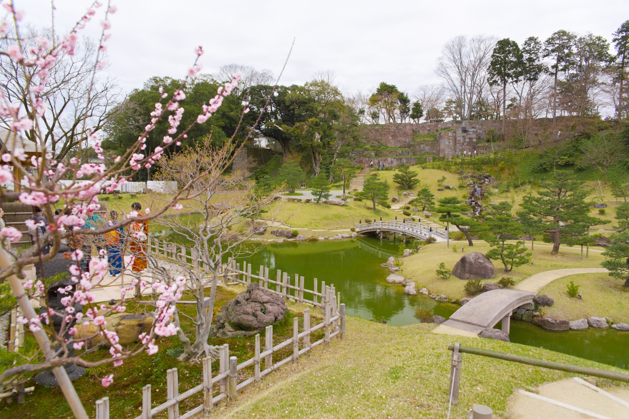 ・Un paysage aquatique abondant alimenté par le canal d'irrigation Tatsumi L'eau de l'étang, véritable source de vie de ce jardin, est encore aujourd'hui puisée dans le canal d'irrigation Tatsumi, l'un des trois grands canaux d'irrigation japonais construits pendant la période Edo. Des techniques avancées, appliquant le principe du siphon inversé (le principe du siphon enterré), poussent l'eau vers les hauteurs du château de Kanazawa, puis la déversent dans les cascades du jardin. Cette technologie, vieille de plus de 400 ans, permet de préserver ce magnifique paysage aquatique.